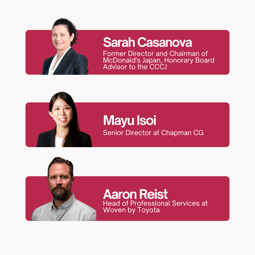 Following strong attendance at our first session, the CCCJ Global Diversity Management Committee invites you to an executive fireside chat featuring Sarah Casanova, former Director and Chairman of McDonald's Japan, and Honorary Board Advisor to the CCCJ, Mayu Isoi, Senior Director at Chapman CG, and Aaron Reist, Head of Professional Services at Woven by Toyota in Tokyo.