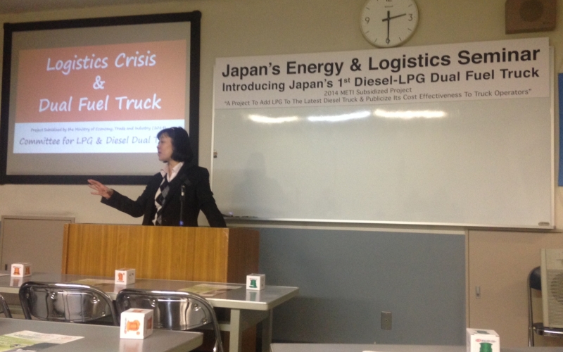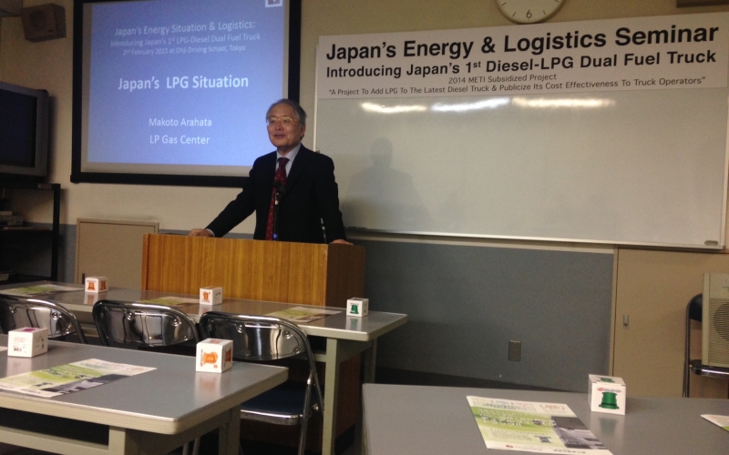 This truck was exhibited at Ohji Driving School (Kita-ku) on February 2nd in which Tom O’Sullivan (Mathyos), Makoto Arahata (LPG Center) and Wilf Wakely (CCCJ) were invited as guest speakers to speak about the current energy and logistics situation in Japan. After the seminar, participants were able to test drive the truck. CCCJ Chair, Wilf Wakely said, “CCCJ is supporting Japanese technologies such as this truck, in order to create new markets that call for an increased demand in Canadian energy resources.”
