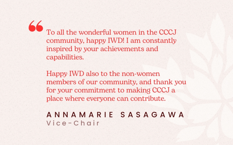 “To all the wonderful women in the CCCJ community, happy IWD! I am constantly inspired by your achievements and capabilities. Happy IWD also to the non-women members of our community, and thank you for your commitment to making CCCJ a place where everyone can contribute.” - Annamarie Sasagawa, Vice Chair