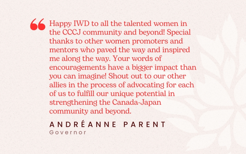 “Happy IWD to all the talented women in the CCCJ community and beyond! Special thanks to other women promoters and mentors who paved the way and inspired me along the way. Your words of encouragements have a bigger impact than you can imagine! Shout out to our other allies in the process of advocating for each of us to fulfill our unique potential in strengthening the Canada-Japan community and beyond." - Andréanne Parent, Governor