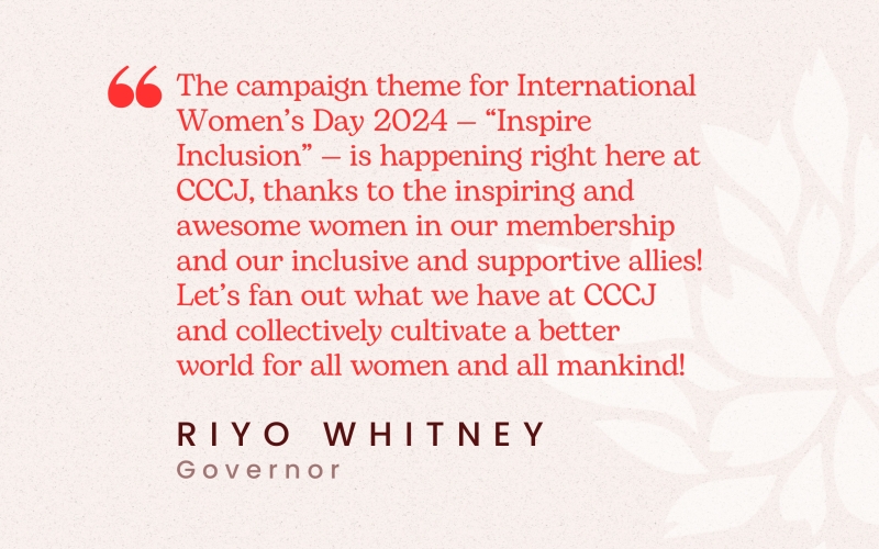 "The campaign theme for International Women’s Day 2024 — “Inspire Inclusion” — is happening right here at CCCJ, thanks to the inspiring and awesome women in our membership and our inclusive and supportive allies! Let’s fan out what we have at CCCJ and collectively cultivate a better world for all women and all mankind!" - Riyo Whitney, Governor