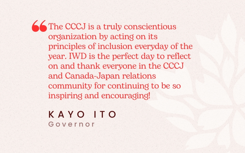 "The CCCJ is a truly conscientious organization by acting on its principles of inclusion everyday of the year. IWD is the perfect day to reflect on and thank everyone in the CCCJ and Canada-Japan relations community for continuing to be so inspiring and encouraging!" - Kayo Ito, Governor