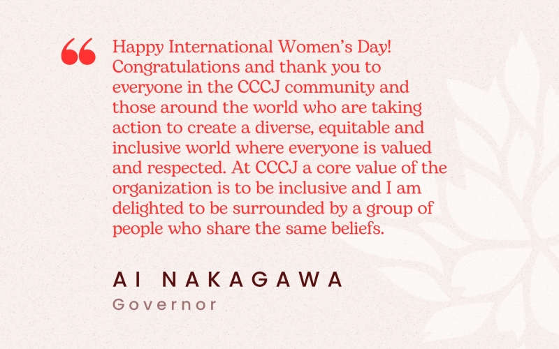 "Happy International Women’s Day! Congratulations and thank you to everyone in the CCCJ community and those around the world who are taking action to create a diverse, equitable and inclusive world where everyone is valued and respected. At CCCJ a core value of the organization is to be inclusive and I am delighted to be surrounded by a group of people who share the same beliefs." - Ai Nakagawa, Governor