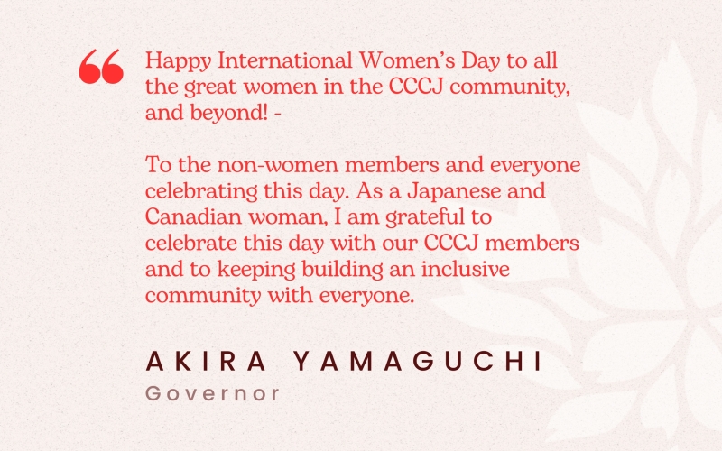 "Happy International Women’s Day to all the great women in the CCCJ community, and beyond! - To the non-women members and everyone celebrating this day. As a Japanese and Canadian woman, I am grateful to celebrate this day with our CCCJ members and to keeping building an inclusive community with everyone." -- Akira Yamaguchi, Governor